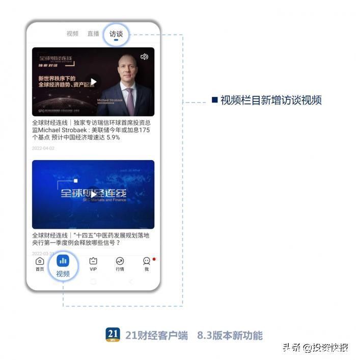 视频栏目在原有的视频、直播类目基础上,将《南财对话》《全球财经连线》《慧见》等南财集团“拳头”融媒体栏目的访谈视频引入新增的访谈类目,用户沉浸式观看,高端访谈一览无余。